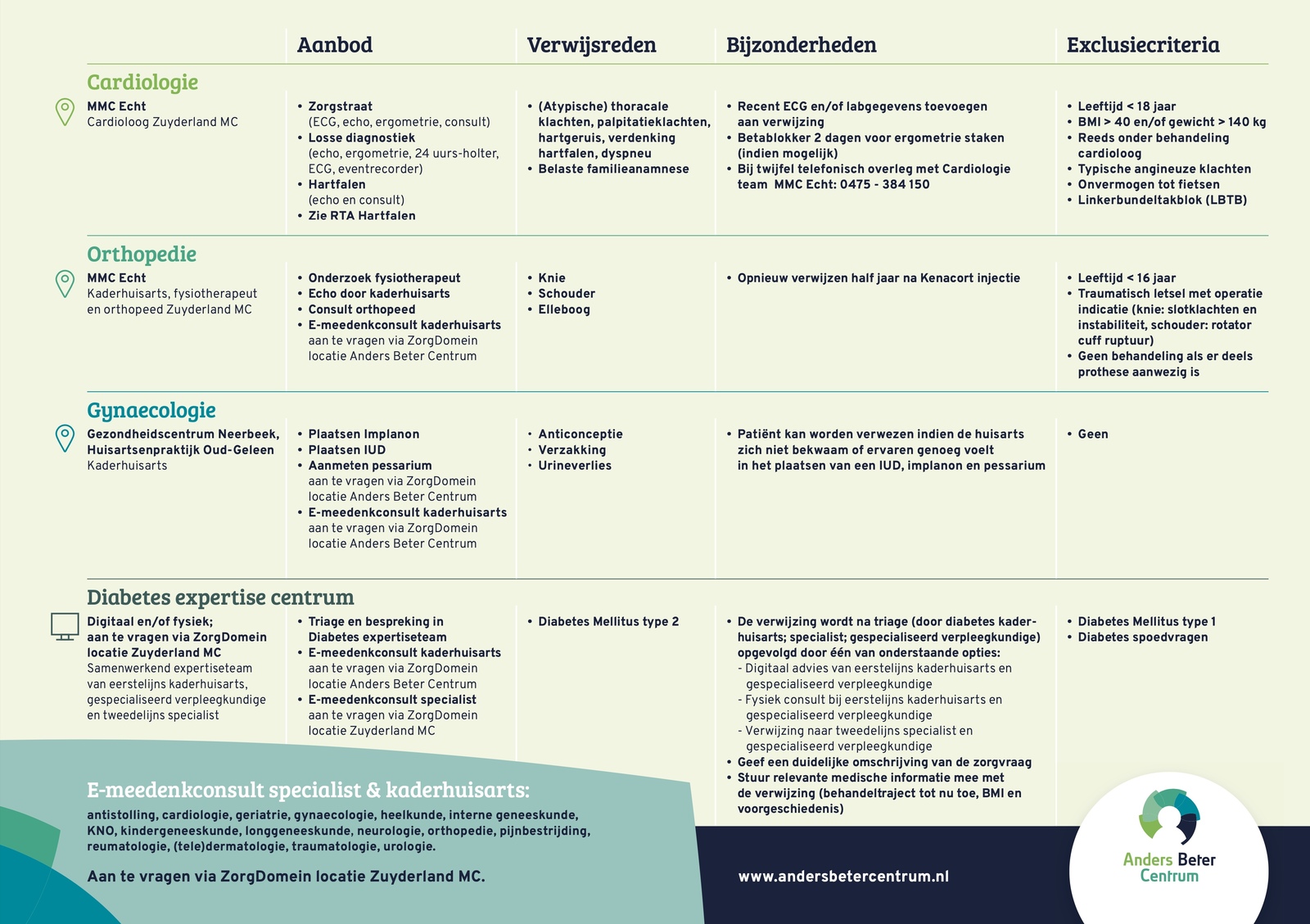 Het complete aanbod van producten en diensten van het Anders Beter Centrum is nu beschikbaar in een handig overzicht voor op je bureau of aan de muur.Per specialisme vind je het aanbod, en belangrijke informatie zoals verwijsreden en -informatie, locatie waar de zorg plaatsvindt en exclusiecriteria.