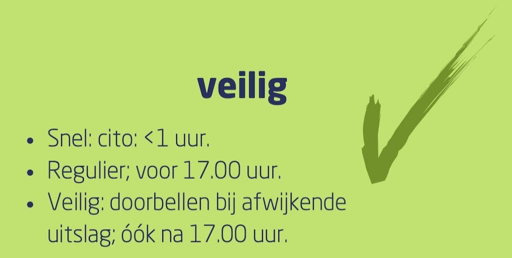 (Patiënt)veiligheid is een aspect dat uitermate belangrijk is: dit wordt gemaximaliseerd door het elektronisch aanvragen (minder foute aanvragen), cito bepalingen waarvan de uitslag binnen 1 uur beschikbaar is en het doorbellen van ernstige afwijkingen. Alle uitslagen (op een enkele uitzondering na) zijn voor 17.00 uur bij de huisarts bekend. Bovendien worden bepalingen die een ernstige afwijking laten zien, na 17.00 uur via de huisartsendienst gecommuniceerd voor verder (acuut) beleid.